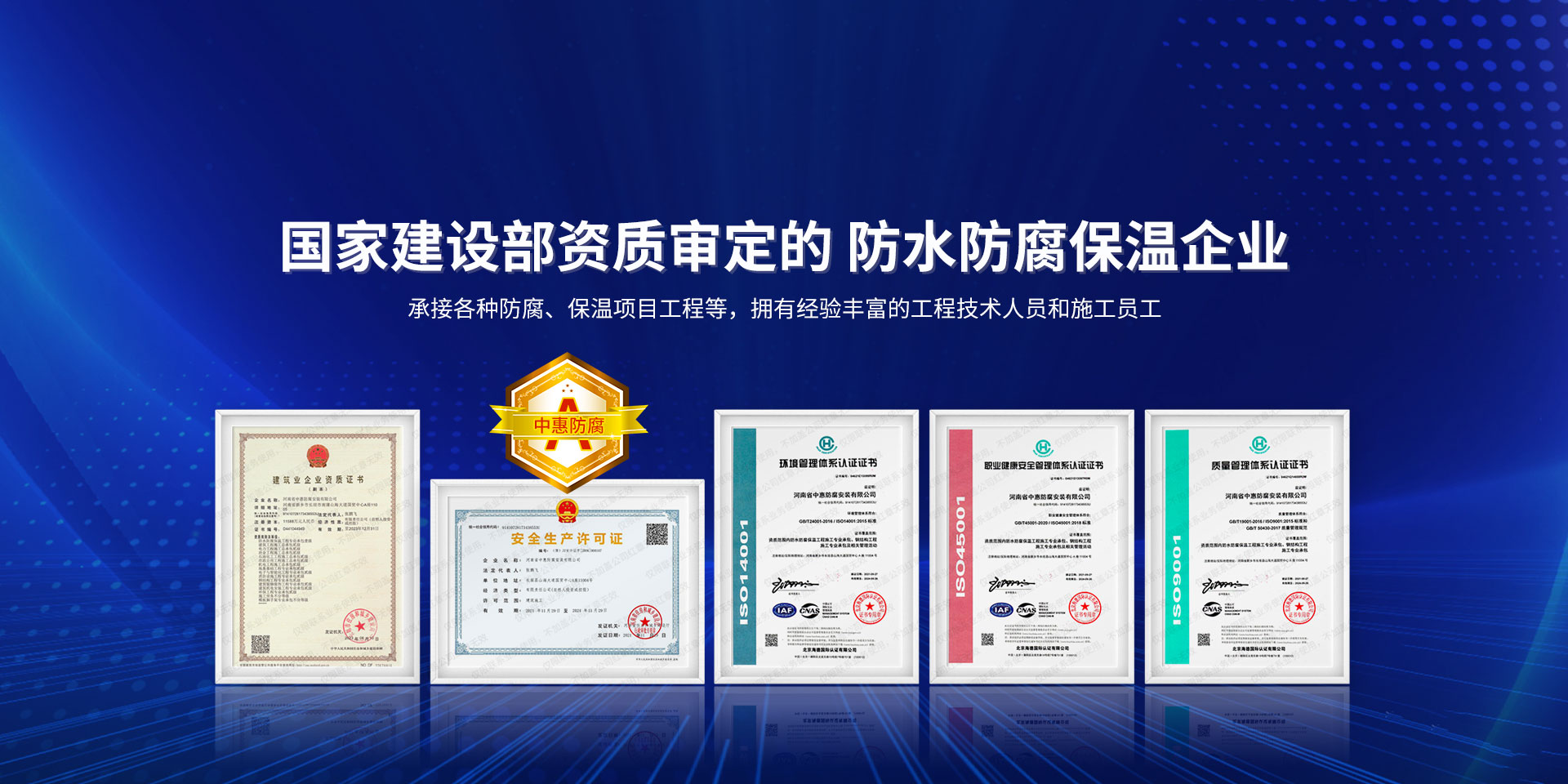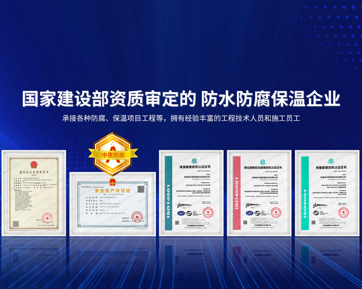 公司經營范圍:防水防腐保溫工程;消防設施工程;建筑裝修裝飾工程;建筑機電安裝工程;電力工程;建筑工程;石油化工工程;工業清洗工程;油罐清洗工程;鋼結構工程;環保工程;模板腳手架工程;電纜防火封堵、防污閃噴涂、外墻外保溫工程;各類施工勞務作業;設備維修、船舶鉚焊、涂裝;電力工程材料、建材、防水材料、防火材料、防腐保溫材料銷售,并相繼通過了GB/T19001-2008idtISO9001:2008GB/T50430-2007質量管理體系認證證書。GB/T24001-2004idtISO14001:2004環境管理體系認證證書。GB/T28001-2011idtOHSAS18001:2007職業健康安全管理體系認證證書。公司是中國防腐蝕于防護協會、中國施工企業管理協會、電力協會和中國鋼結構防水協會會員單位。 公司的經營業務涵蓋了石油、化工、電力、冶金、煤炭、船舶、國防、燃氣、水利、環保、交通運輸、航空及國防軍工和輕紡市政等行業的防腐保溫絕熱設備。鋼結構安裝、防火、防水、金屬噴鍍、聚脲噴繪、陰極保護、防滲透堵漏、玻璃鋼及各種磚版材料襯里、橡膠襯里、煙氣硫和耐酸溶劑腐蝕等工程施工。公司連續十年榮獲“省市先進施工企業”“安全生產先進單位”“重合同,守信用企業”和“AA***資質企業”的稱號。2000年被命名為市級文明單位,2002年被國家工商行政管理局命名為“重合同,守信用的企業”、被中國工業防腐蝕技術協會命名為“防腐蝕企業,能源節約及環境保護領域有豐富的經驗和***的業績。工程一次交驗合格率100%。其中攀枝花鋼鐵公司煉鐵廠四號高爐及熱風爐防腐工程、上海寶鋼公司煤氣柜防腐工程、撫順石油一廠裝置防腐項目、齊魯石化公司稀烴廠高塔防腐工程、吉林化學工業公司煉油廠油罐防腐工程、天津石化熱電廠六號爐頂棚聯絡管保溫工程、大慶油田(太倉)力神泵業工程、中國化學工程第十一建設工程、中原油田勘探局工程、中國石化銷售有限公司華北分部、魯皖輸油管道工程、貴州開磷息烽合成氨工程、陜西黃陵煤化工程、中國石油天然氣西部管道塔里木輸油工程、邯鋼集團邯寶鋼鐵公司煉鐵工程、德州供電工程、吉寶(南通)船廠工程,偃師華潤熱力工程、鄭州熱力總公司。 河南省中惠防腐安裝有限公司愿以豐富的施工經驗,***的技術,***的設備,***的管理,***的服務,竭誠為國內外廣大的用戶提供***滿意、******的工程作品。 我公司愿與國內外同仁一道,團結協作,共同推進防腐蝕行業發展! 公司地址:河南省長垣縣建設路北段360號 固定電話:0373-8866488 郵編:453400 網址:http://www_zhff_com_cn.zhe586.com